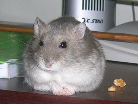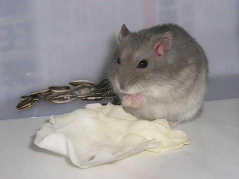 這隻鼠在我那凌亂不堪的電腦桌上發現一張衛生紙,牠想把牠啣回家,所以死命的把紙往嘴裡塞;就算家兄把牠捧起來,牠還是咬著紙不放。